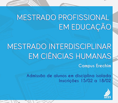 Estarão abertas, no período de 15 a 18 de fevereiro, as inscrições para os interessados em cursar disciplinas isoladas no Mestrado Interdisciplinar em Ciências Humanas e no Mestrado Profissional em Educação da Universidade Federal da Fronteira Sul (UFFS), ambos ofertados no Campus Erechim.