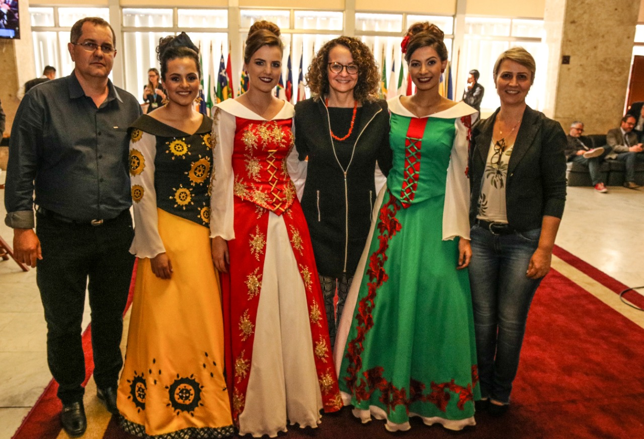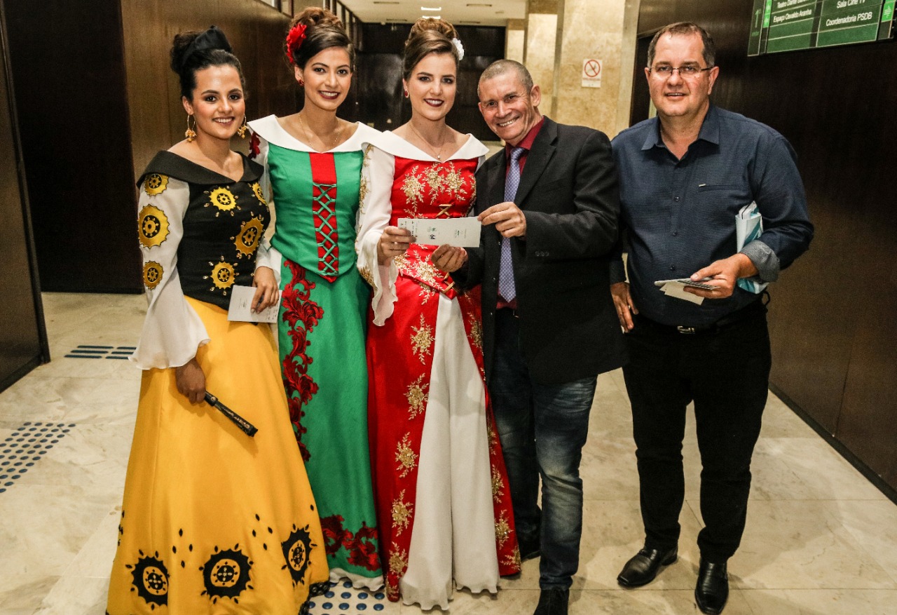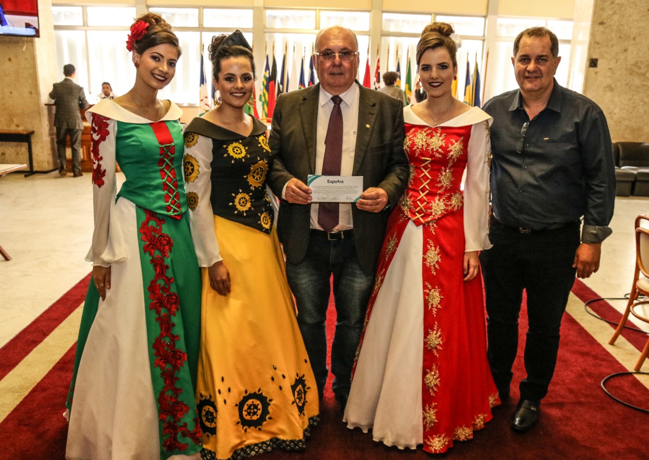 O presidente da 32ª Expoara, Everaldo Dalazen e a primeira dama de Aratiba, Neli Granzotto, juntamente com a rainha Rainha Andressa Kambler, que representa a etnia alemã, a princesa representante dos afrodescendentes, Eduarda Flores Lerner e a princesa representando a etnia italiana, Bruna Baiocco,visitaram vários deputados, na Assembleia Legislativa, em Porto Alegre, nesta semana. Nos contatos, divulgaram a feira e fizeram o convite para as autoridades visitarem o Parque de Eventos nos dias 4, 5 e 6 de outubro, quando acontece a Expoara 2019.