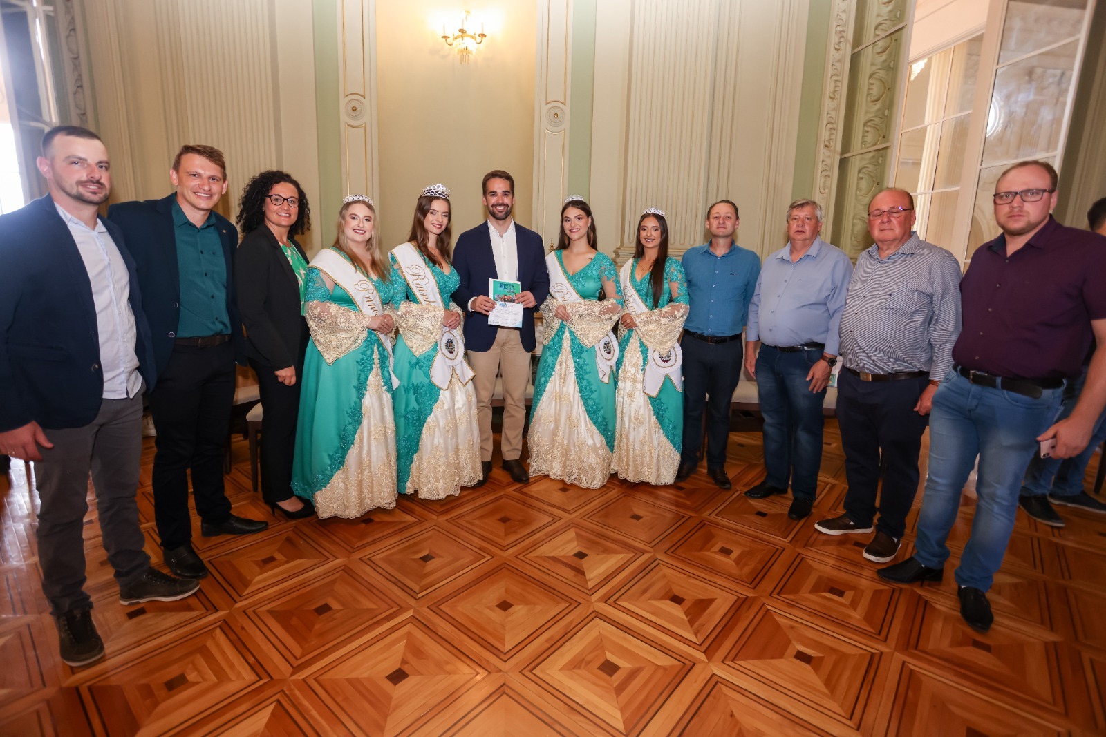 As soberanas Daniele Oldra, Gwendoline Nazzari, Grasiela Carus e Larrisa Cavalheiro, o prefeito Josiel Fernando Griseli, a primeira-dama Jônia Celi, o vice-prefeito Élsio Carlos Valduga, o coordenador da feira Clairton Spazzini Barro, e o presidente da Câmara de Vereadores Darlan Zapani, também estiveram participando da agenda.