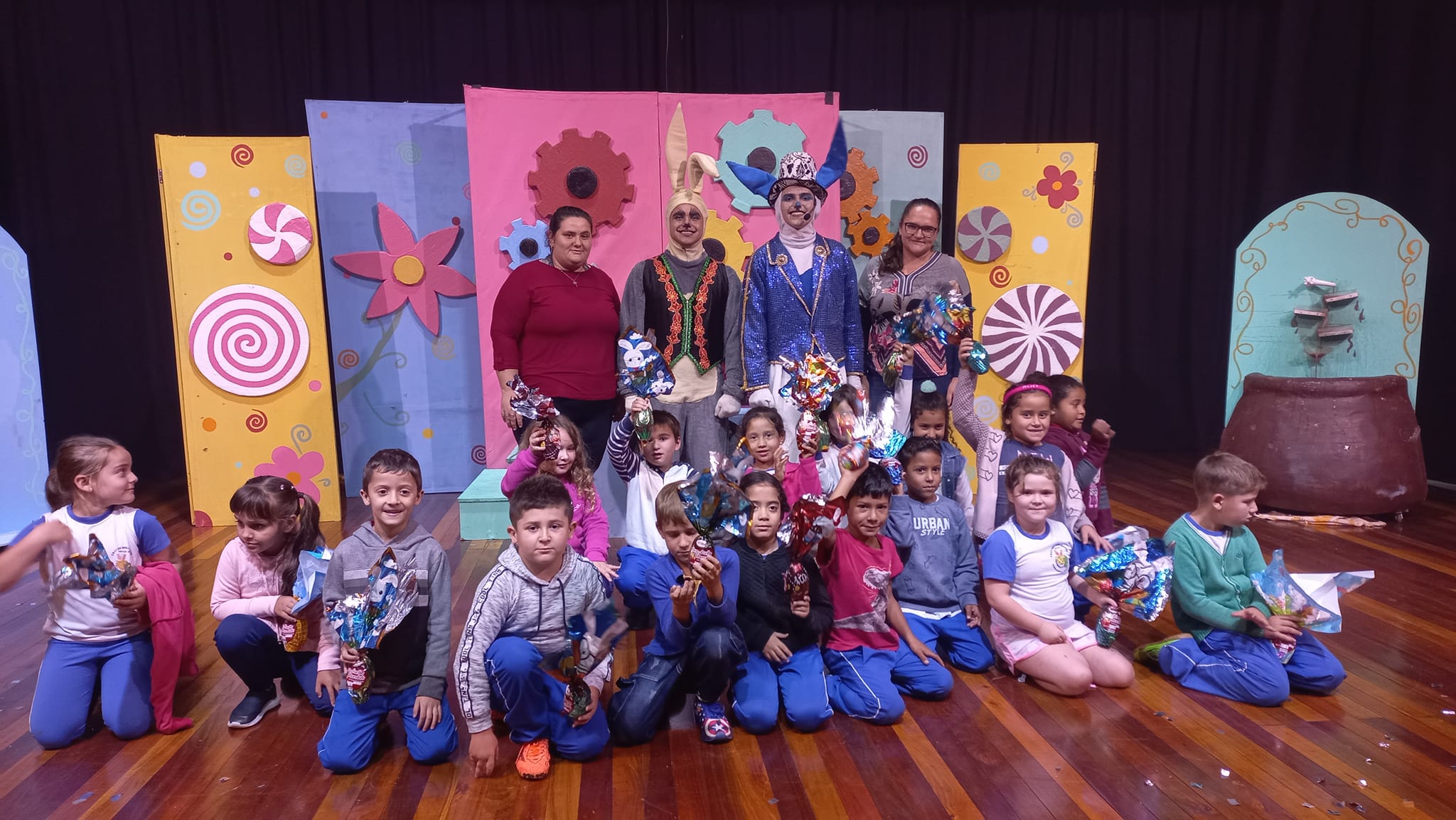 As crianças foram convidadas para assistir uma linda peça teatral sobre a Páscoa estrelada pelo grupo Aldeia Teatral de Machadinho. A peça “A Fábrica Mágica da Páscoa” chama a atenção para a simbologia e a expectativa das crianças pelos doces de chocolate.