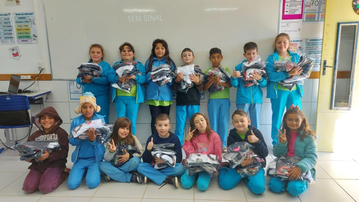 A Secretaria Municipal de Educação de Machadinho está realizando a entrega de uniformes escolares para os alunos da rede municipal de ensino. A iniciativa tem como objetivo garantir a equidade, a identificação dos estudantes e oferecer mais conforto e segurança durante as atividades escolares. Além disso, cumpre a Lei Municipal n° 3.194/2021, que institui a obrigatoriedade do uso do uniforme escolar na rede pública municipal. O kit de uniformes entregue contém sete peças: duas camisetas de manga longa, duas de manga curta, calça, calção e jaqueta.