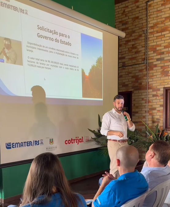 Para fomentar a cultura da laranja, no Rio Grande do Sul, o prefeito apresentou uma proposta de convênio entre o Estado e os municípios interessados para implantação de novos pomares de laranja. “O valor seria em torno de R$ 200 mil para implantar 20 hectares de laranja por município, com custo médio de R$ 10 mil por hectare. O município seleciona as famílias, que irão participar do projeto, enfim, aplica os recursos da melhor forma”, destaca ele.