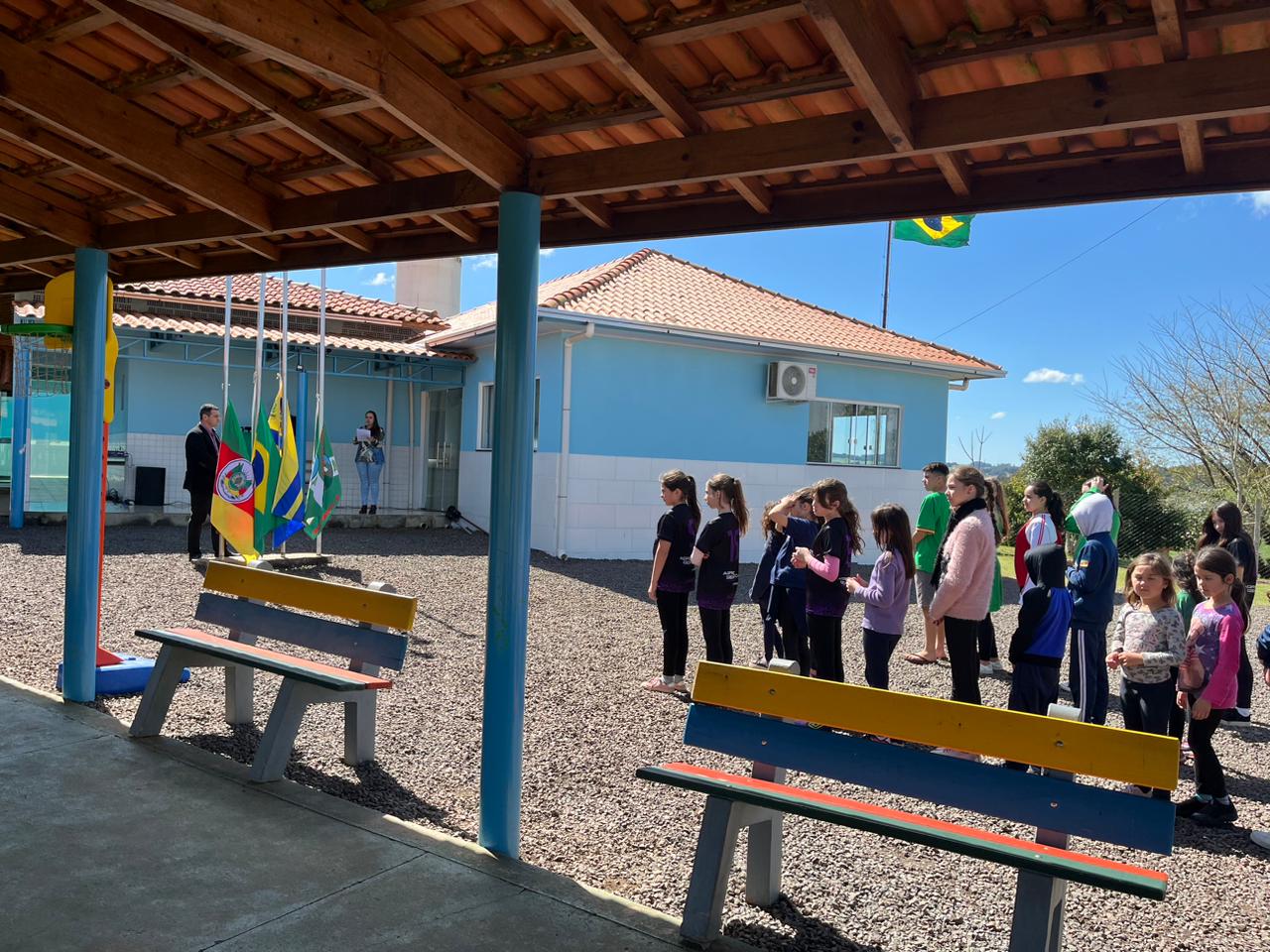 Em seguida, foi entoado o Hino Nacional Brasileiro com a participação de autoridades, professores, estudantes e comunidade. O ato também registrou a presença da Brigada Militar, secretários municipais e representantes da Liga da Defesa Nacional, entre eles o coronel RR Ataíde Moraes Rodrigues (coordenador), a 1ª tenente feminina RR Magali Terezinha Lima Rodrigues, o sargento RR Luis Carlos Ribeiro Ferreira e o soldado PM Daverson da Rosa Arce.