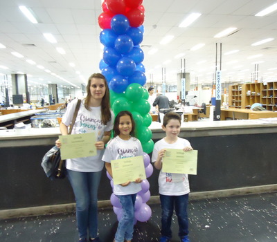 Da área de abrangência da 15ª Coordenadoria Regional de Educação (CRE) foram premia- dos os trabalhos dos alunos Caetano Batistelli, do primeiro ano do ensino fundamental do Colégio Sananduva; Keilla dos Santos Trentin, do segundo ano do ensino fundamental e Chaiana Sara Munaro Appelt, do terceiro ano do ensino médio, ambas estudantes da Escola Estadual de Educação Básica Aratiba.