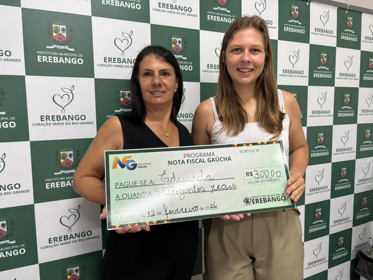 Uma moradora de Erebango realizou a retirada do prêmio de R$ 300,00 referente ao Programa Nota Fiscal Gaúcha. Conforme informações da Prefeitura Municipal, a contemplada Eduarda Cristina Malycz compareceu ao Centro Administrativo para receber o valor obtido no sorteio.